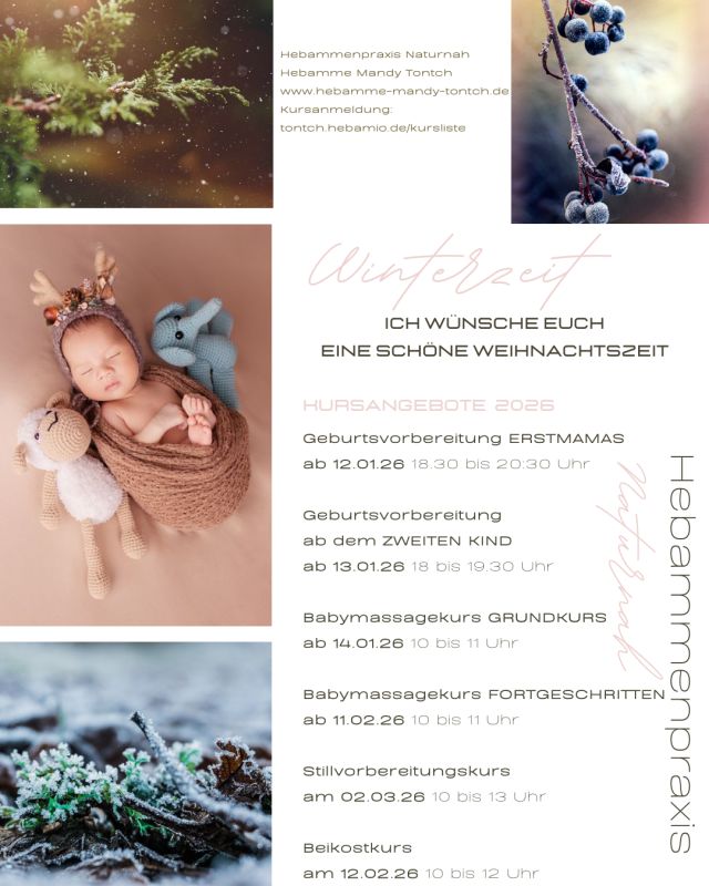 Schaut gern in die Kursangebote auf meiner Homepage. Es finden Geburts- und Rückbildungskurse statt, sowie Stillvorbereitungs-, Beikost- und Babymassagekurse. Das Kursangebot soll stetig erweitert werden. Ich halte Euch auf meiner Homepage und auch bei Instagram immer auf dem Laufenden.